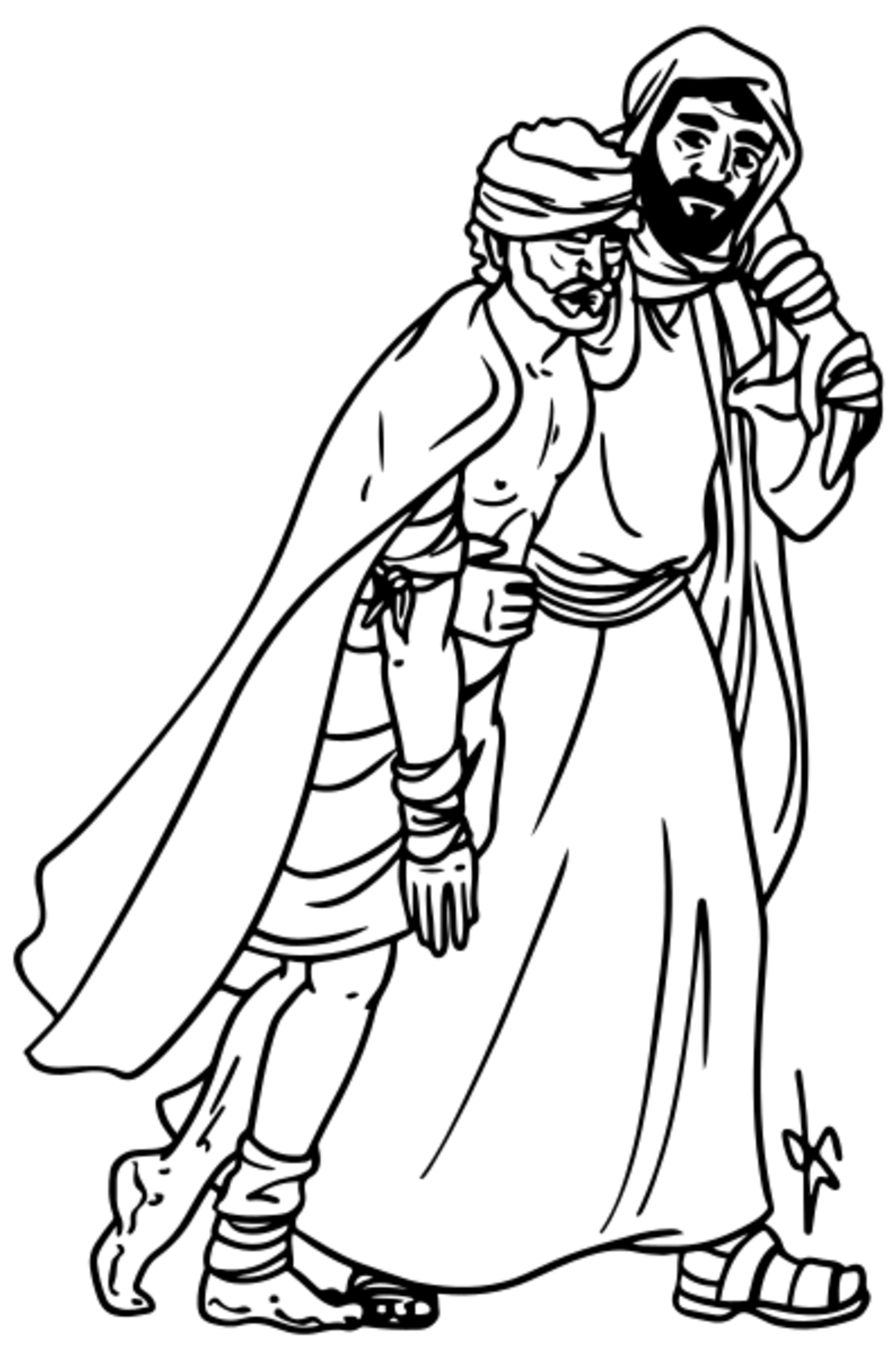 - 34 : Il s’approcha, et pansa ses blessures en y versant de l’huile et du vin ; puis il le chargea sur sa propre monture, le conduisit dans une auberge et prit soin de lui.